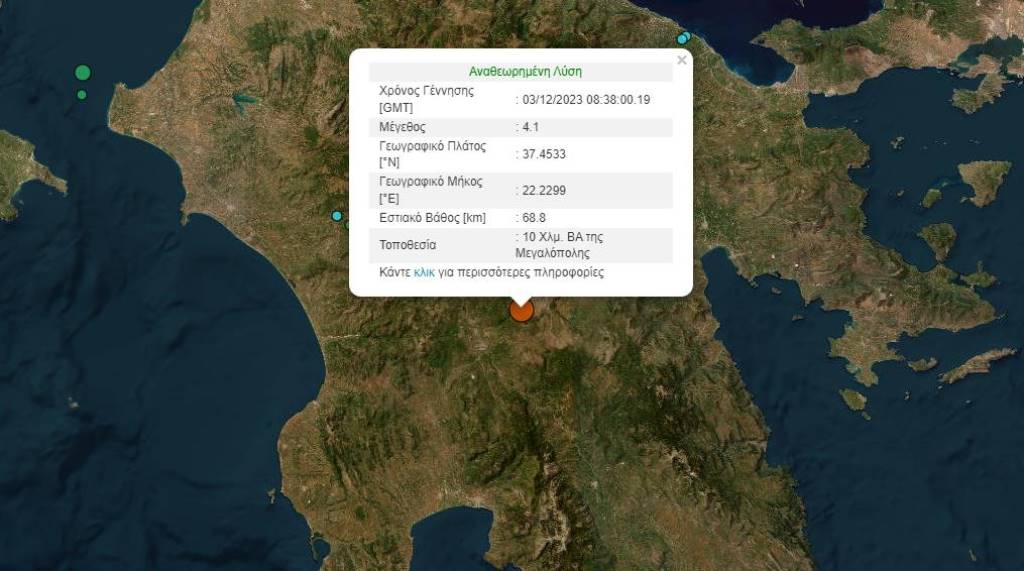 Το επίκεντρο εντοπίζεται 10 χλμ. ΒΑ της Μεγαλόπολης, ενώ το εστιακό βάθος του σεισμού ήταν 68,8 χιλιόμετρα.