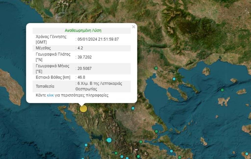 Το επίκεντρο εντοπίζεται 5 χιλιόμετρα βόρεια της Λεπτοκαριάς Θεσπρωτίας σε εστιακό βάθος 33,1 χιλιομέτρων, ανακοίνωσε το Γεωδυναμικό Ινστιτούτο του Εθνικού Αστεροσκοπείου Αθηνών.