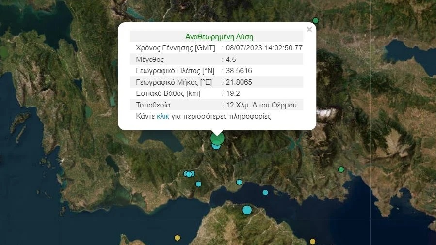 Το επίκεντρο του σεισμού, ο οποίος σημειώθηκε στις 5:02 μ.μ. το Σάββατο, εντοπίζεται 12 χιλιόμετρα ανατολικά του Θέρμου Αιτωλοακαρνανίας.