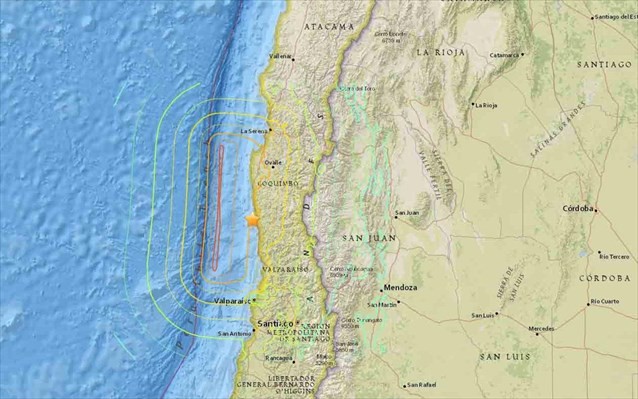 Το επίκεντρο του σεισμού, ο οποίος αρχικά καταγράφηκε ως 6,8 βαθμών, εντοπίστηκε 88 χιλιόμετρα νοτιοδυτικά του Κοκίμπο στη Χιλή, και 460 χιλιόμετρα νοτιοδυτικά της πρωτεύουσας Σαντιάγο. Είχε εστιακό βάθος 33 χιλιομέτρων.