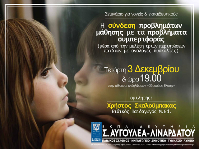 Την Τετάρτη 3 Δεκεμβρίου 2014 και ώρα 19:00, με τον Ειδικό Παιδαγωγό M. Ed., στην ιδιαίτερα ενδιαφέρουσα ομιλία του με θέμα: «Η σύνδεση προβλημάτων μάθησης με τα προβλήματα συμπεριφοράς».