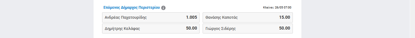 Μάλιστα μια από τις μεγαλύτερες εταιρείες στοιχήματος στην Ελλάδα έχει βγάλει αποδόσεις για τον επόμενο Δήμαρχο της πόλης μας έχοντας μάλλον ένα λάθος στις επιλογές της αφού αναφέρει στους υποψήφιους και τον Δημήτρη Κελάφα που δεν έχει δηλώσει ότι θα συμμετέχει ξανά.