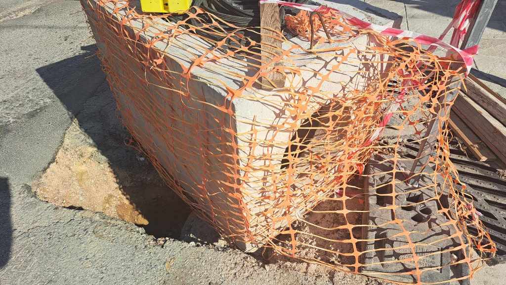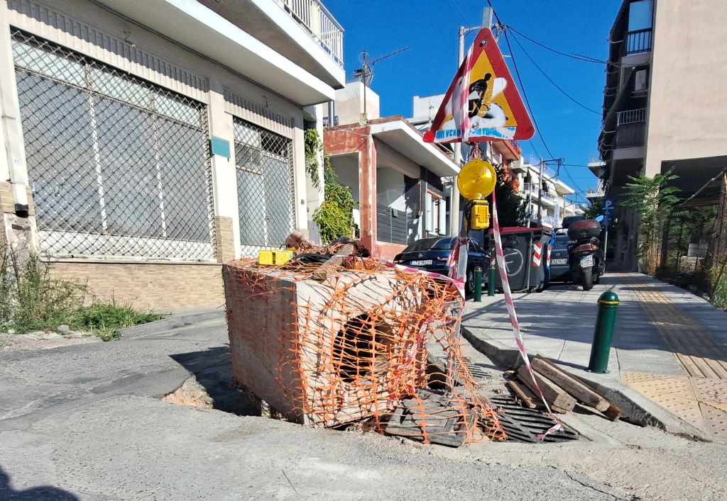 Η συγκεκριμένη τεράστια τρύπα στο οδόστρωμα που έχει καλυφθεί εν μέρει με ένα τσιμεντένιο φρεάτιο βρίσκεται επί της οδού Καρυάτιδος στη συμβολή της με την Αδμητού.