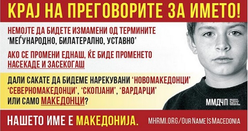 Δεκάδες γιγαντοαφίσες με μότο «Το όνομά μας είναι Μακεδονία», γέμισαν τους δρόμους των Σκοπίων. Την αφισοκόλληση έκανε η η εθνικιστική οργάνωση «”Μακεδονική” Ένωση Ανθρωπίνων Δικαιωμάτων» (MHRMI).