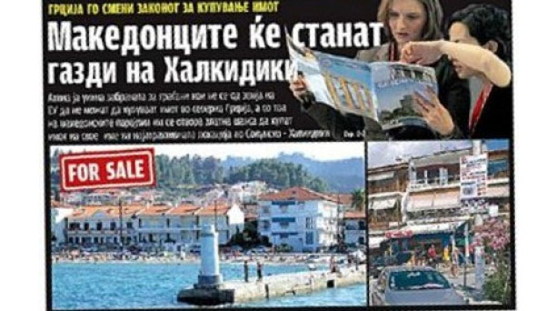 «Στην Ελλάδα έχει αλλάξει ο νόμος που απαγόρευε την αγορά ακινήτων, από πολίτες χωρών μη μελών της Ευρωπαϊκής Ένωσης . Αυτό σημαίνει πως οι “Μακεδόνες” πολίτες μπορούν πλέον ελεύθερα να αποκτήσουν για λογαριασμό τους, περιουσία στο τμήμα της Μακεδονίας του Αιγαίου και κυρίως στη Χαλκιδική, αλλά και στη Θεσσαλονίκη» αναφέρει χαρακτηριστικά το προκλητικότατο δημοσίευμα.