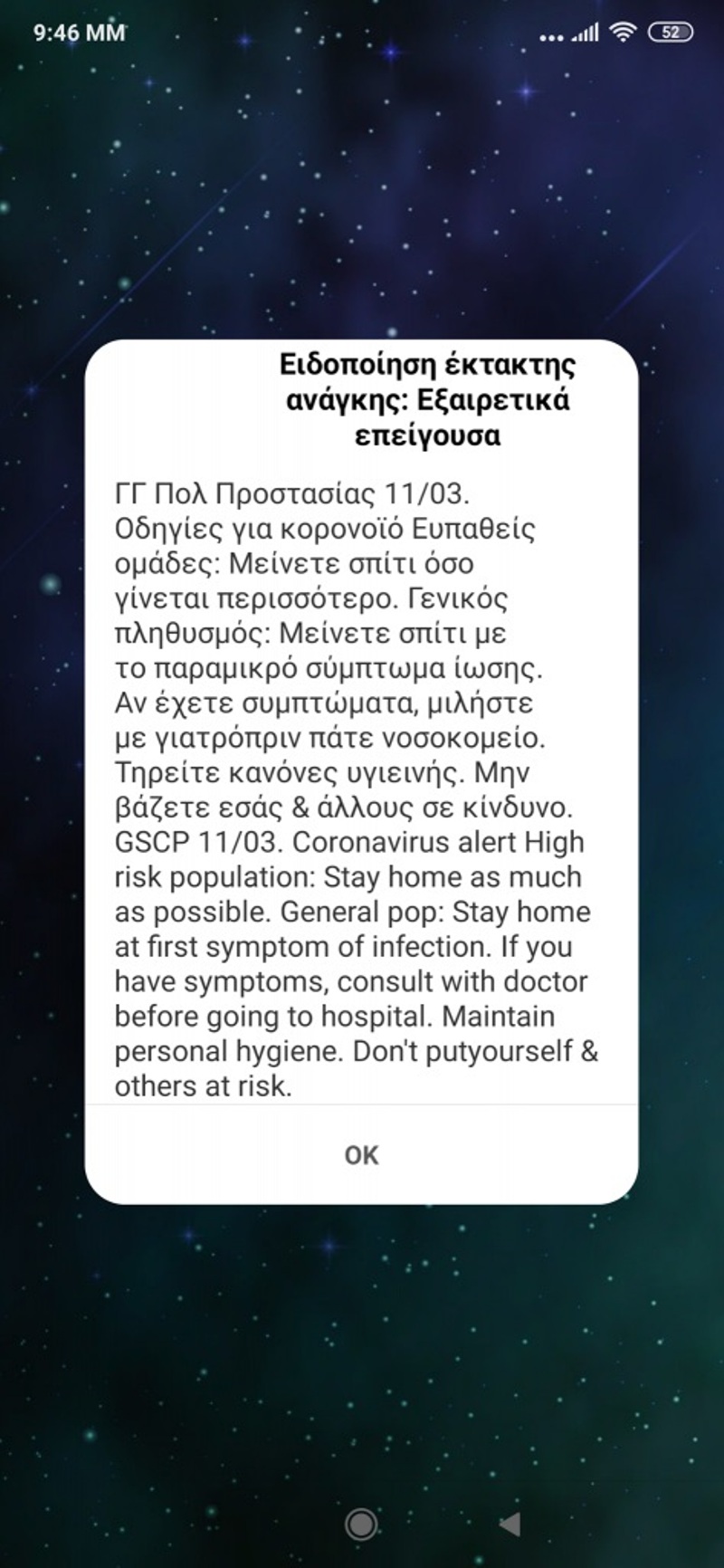 «Επείγουσα ειδοποίηση. ΓΓΠΠ 11/3. Οδηγίες για κορωνοϊό. Ευπαθείς ομάδες: Μείνετε σπίτι όσο γίνεται περισσότερο. Γενικός πληθυσμός: Μείνετε σπίτι με το παραμικρό σύμπτωμα ίωσης. Αν έχετε συμπτώματα, μιλήστε με γιατρό πριν πάτε νοσοκομείο. Τηρείτε κανόνες υγιεινής. Μη βάζετε εσάς και άλλους σε κίνδυνο», αναφέρεται στο μήνυμα.