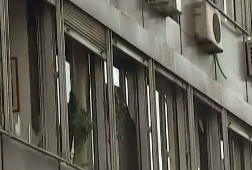 Σπασμένα όλα τα τζάμια του κτιρίου ενώ μέσα υπάρχουν εργαζόμενοι που κάνουν στάση εργασίας.