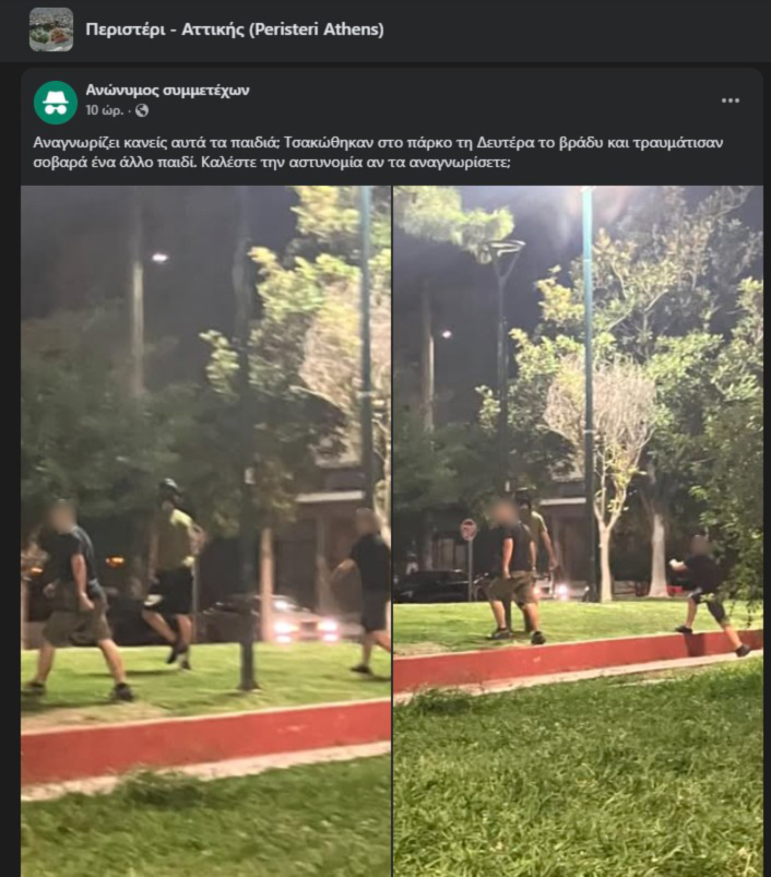Ανησυχία έχει προκαλέσει στo Περιστέρι μια καταγγελία που κυκλοφορεί από το βράδυ της Δευτέρας στα social media σχετικά με σοβαρό περιστατικό βίας σε πλατεία.