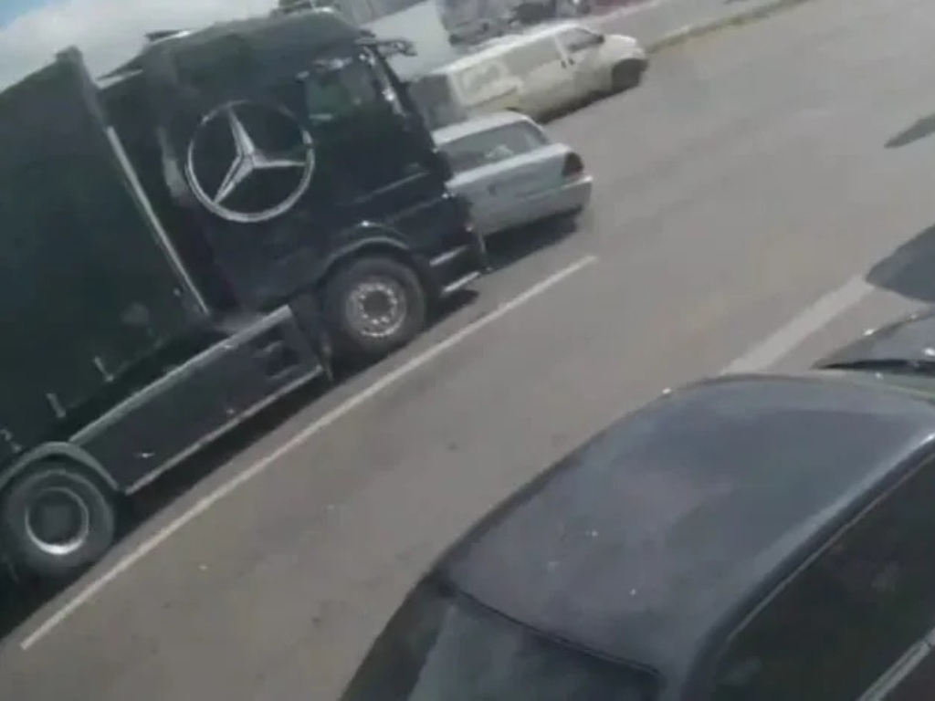 Για άγνωστό λόγο, λευκό ΙΧ μπαίνει στη λωρίδα που κινείται νταλίκα με αποτέλεσμα το βαρύ όχημα να μην μπορεί να σταματήσει έγκαιρα και να παρασύρει το ΙΧ.
