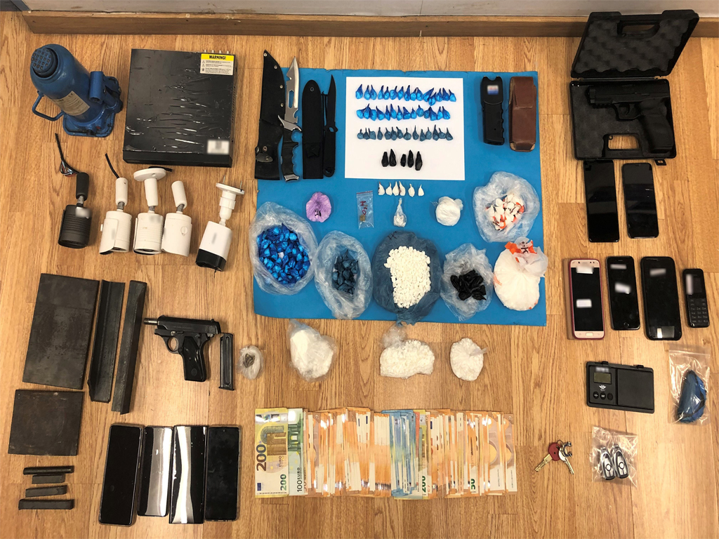 Κατά την διάρκεια οργανωμένης επιχείρησης σε επτά σπίτια στην Αττική, με την συνδρομή ομάδων της ΕΚΑΜ και ειδικά εκπαιδευμένου σκύλου, οι αστυνομικοί της Δίωξης συνέλαβαν έξι άτομα, μέλη της οργάνωσης, ηλικίας 27 έως 52 ετών, σε βάρος των οποίων σχηματίστηκε δικογραφία αυτόφωρης διαδικασίας, κακουργηματικού χαρακτήρα, για τα -κατά περίπτωση- αδικήματα της εγκληματικής οργάνωσης και παραβάσεις για ναρκωτικά και όπλα.
