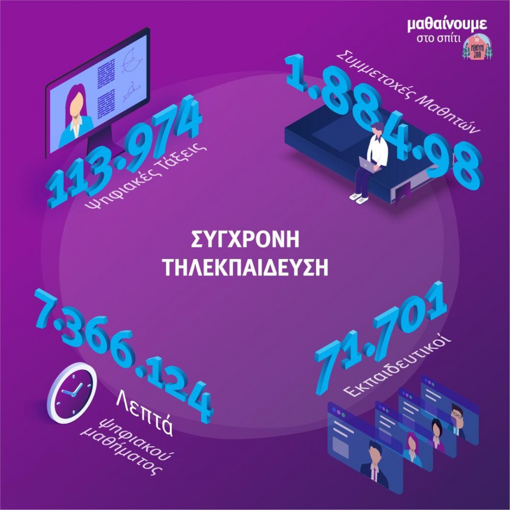 Στη σύγχρονη εκπαίδευση καταγράφηκαν 1.885.000 συμμετοχές μαθητών σε ψηφιακές τάξεις (Webex) και 71.701 εκπαιδευτικοί έχουν δημιουργήσει την προσωπική ψηφιακή τους τάξη, ενώ είχαν δημιουργηθεί 113.974 ψηφιακές τάξεις.