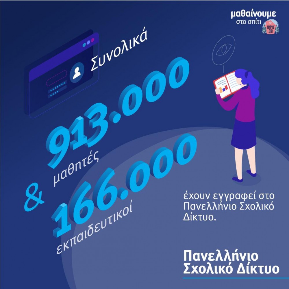 Στην ασύγχρονη εκπαίδευση, περισσότεροι από 913.000 μαθητές και 166.000 εκπαιδευτικοί έχουν εγγραφεί στο Πανελλήνιο Σχολικό Δίκτυο.