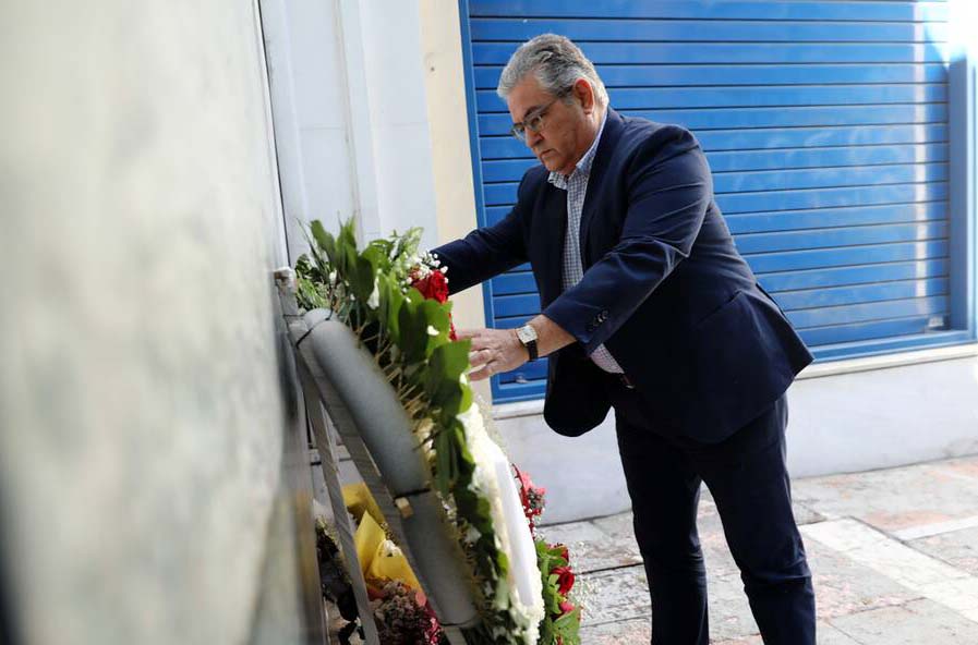 Ο Δημήτρης Κουτσούμπας κατέθεσε στεφάνι στη Marfin στην οδό Σταδίου όπου πριν 10 χρόνια 3 εργαζόμενοι είχαν βρει το θάνατο, μετά από εμπρησμό με μολότοφ.