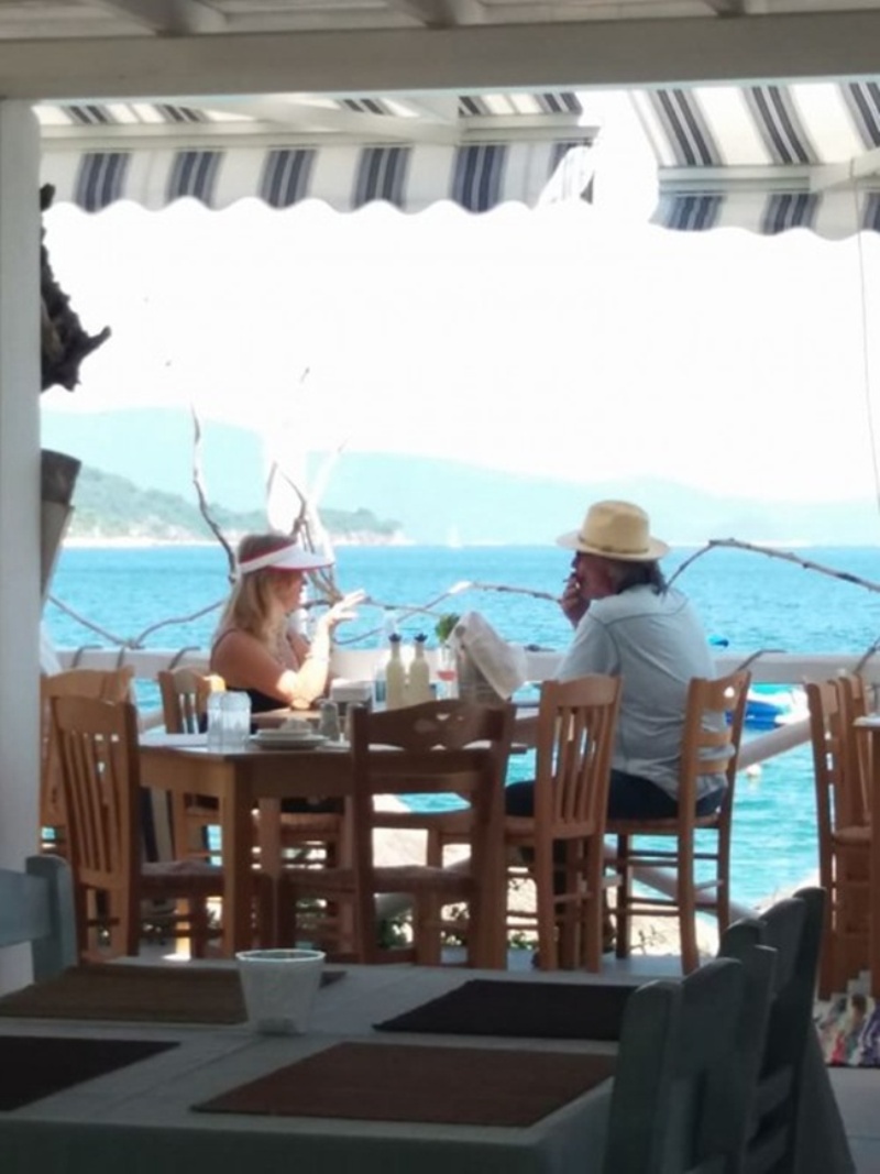 Οι δύο διάσημοι καλλιτέχνες είναι απλοί και φιλικοί, επιλέγουν διάφορες παραλίες της Σκιάθου για να απολαύσουν το μπάνιο τους, ενώ προτιμούν να δειπνούν σε παραδοσιακά ταβερνάκια του νησιού δίπλα στο κύμα.