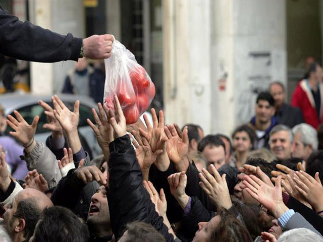 «Εκατοντάδες άνθρωποι σπρώχνονταν για δωρεάν λαχανικά που μοίρασαν αγρότες σε μία συμβολική διαμαρτυρία την Τετάρτη, ποδοπατώντας έναν άνθρωπο και προκαλώντας κατακραυγή για την αυξανόμενη απόγνωση που δημιουργήθηκε από την οικονομική κρίση» σημειώνει το πρακτορείο ειδήσεων.