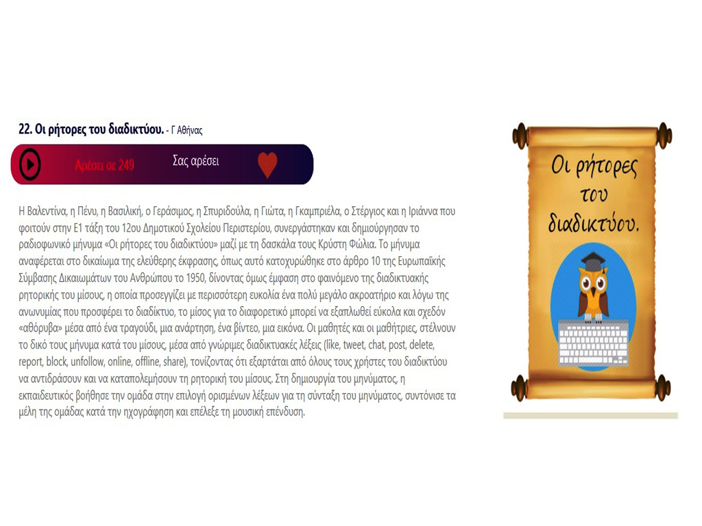 Στηρίζουμε όλοι τη συμμετοχή του 12ου Δημοτικού Σχολείου Περιστερίου στον σχολικό διαγωνισμό ραδιοφωνικό μήνυμα του European School Radio, “Οι ρήτορες του διαδικτύου”.