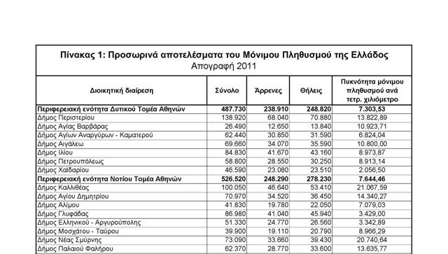Η Ελληνική Στατιστική Αρχή (ΕΛ.ΣΤΑΤ.) διενήργησε την Απογραφή Πληθυσμού – Κατοικιών 2011 κατά το χρονικό διάστημα από 10 έως και 24 Μαΐου 2011 και ανακοινώνει τα προσωρινά αποτελέσματα που αφορούν στο Μόνιμο Πληθυσμό της Χώρας.