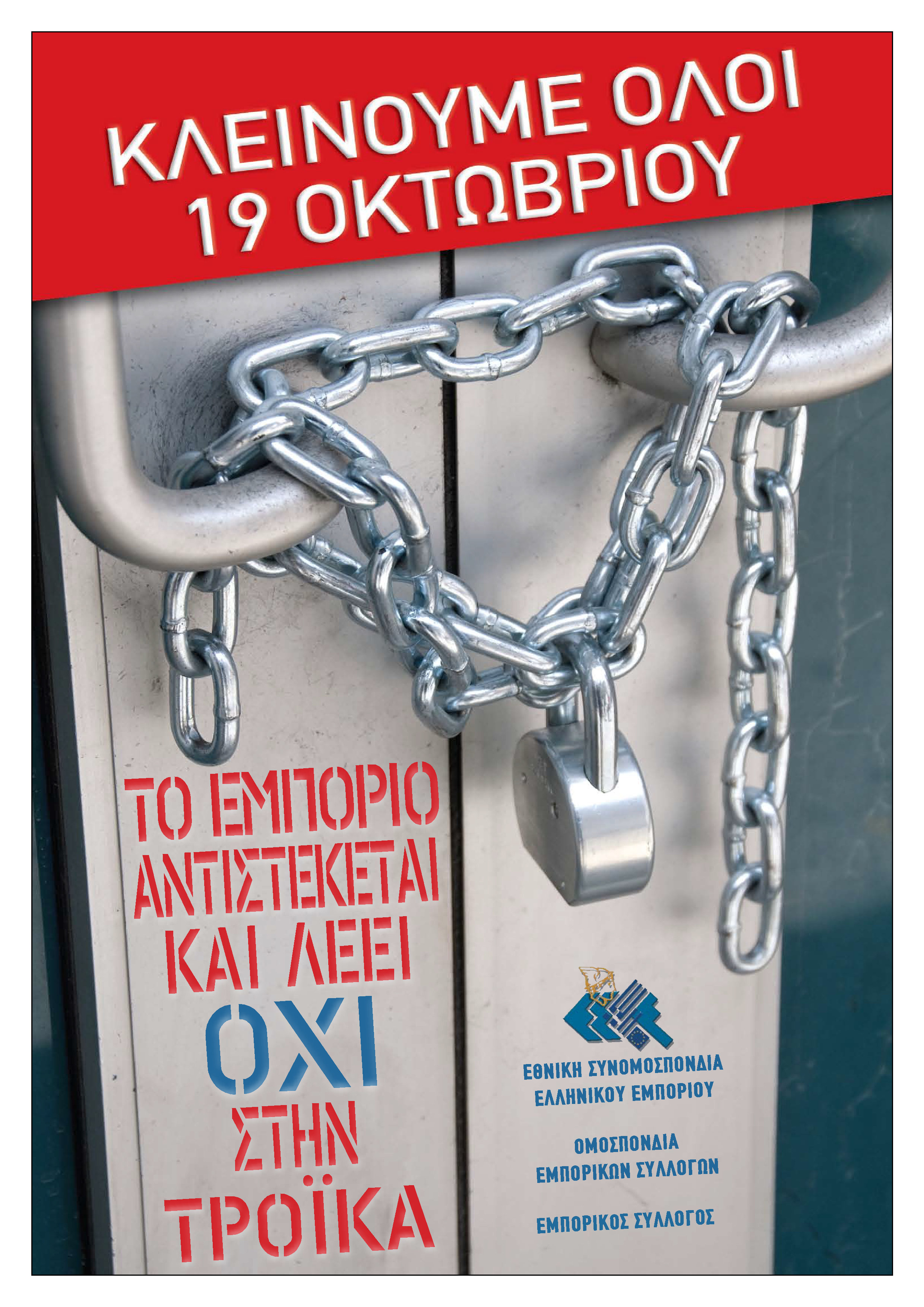 «Η Εθνική Συνομοσπονδία Ελληνικού Εμπορίου συμμετέχει στη μεγάλη πανελλαδική κινητοποίηση της 19ης Οκτωβρίου και κηρύσσει την ημέρα αυτή ημέρα μηδενικού τζίρου για την αγορά και μηδενικών εσόδων για το δημόσιο».