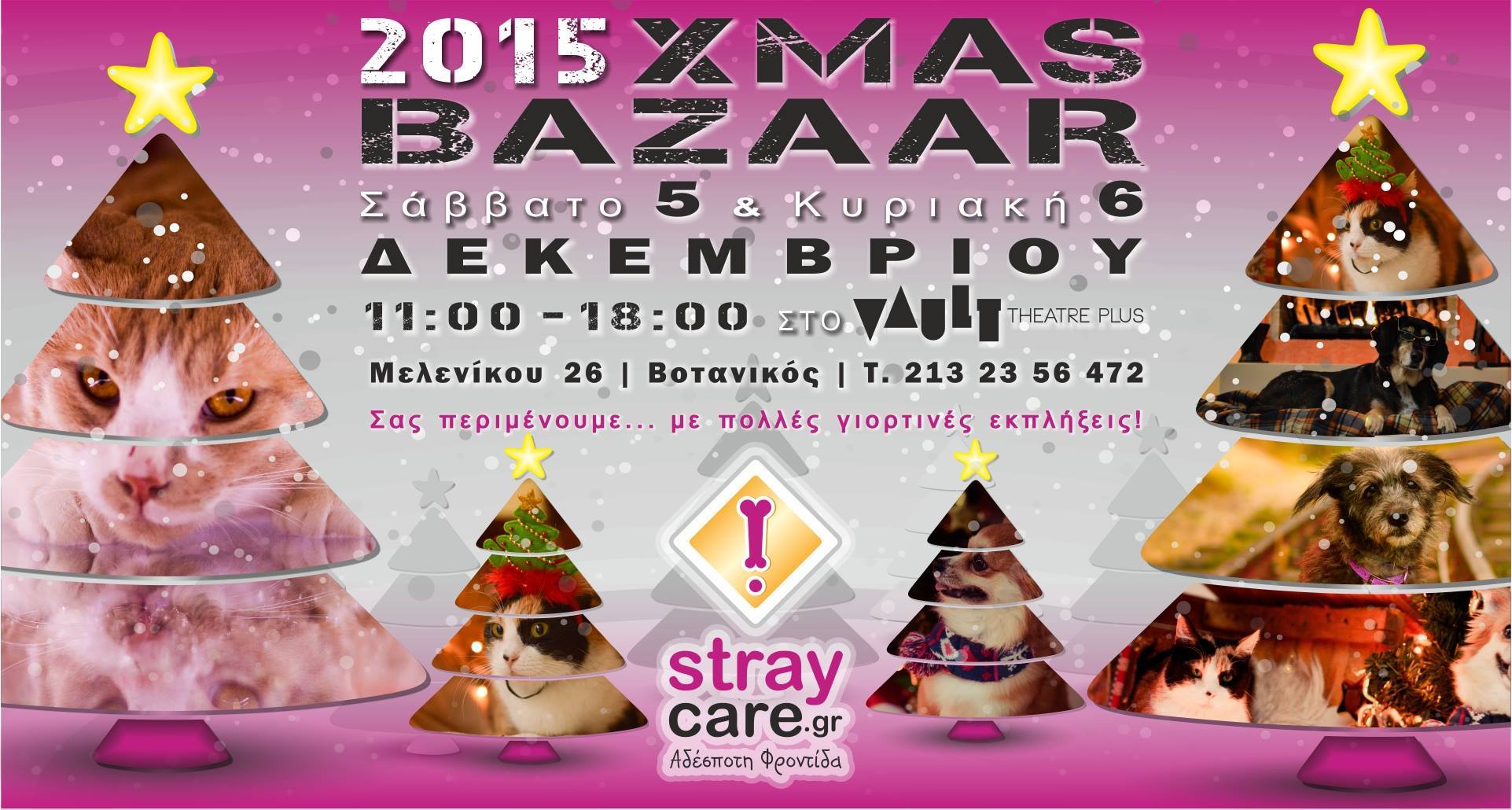 To Σάββατο 5 Δεκεμβρίου και την Κυριακή 6 Δεκεμβρίου 2015, από τις 11:00π.μ μέχρι τις 18:00μμ, θα πραγματοποιηθεί το Χριστουγεννιάτικο Bazaar του «Straycare.gr Αδέσποτη φροντίδα» στον Εναλλακτικό Πολυχώρο Vault, Μελενίκου 26, Βοτανικός (πλησίον στάση μετρό Κεραμεικός).