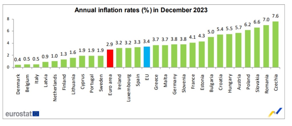 Στο 3,7% διαμορφώθηκε στην Ελλάδα ο ετήσιος πληθωρισμός τον Δεκέμβριο 2023, σύμφωνα με τα στοιχεία της Eurostat. Στην Ευρωζώνη, ο πληθωρισμός αυξήθηκε στο 2,9% από 2,4% και στην ΕΕ στο 3,4% από 3,1% τον Νοέμβριο.