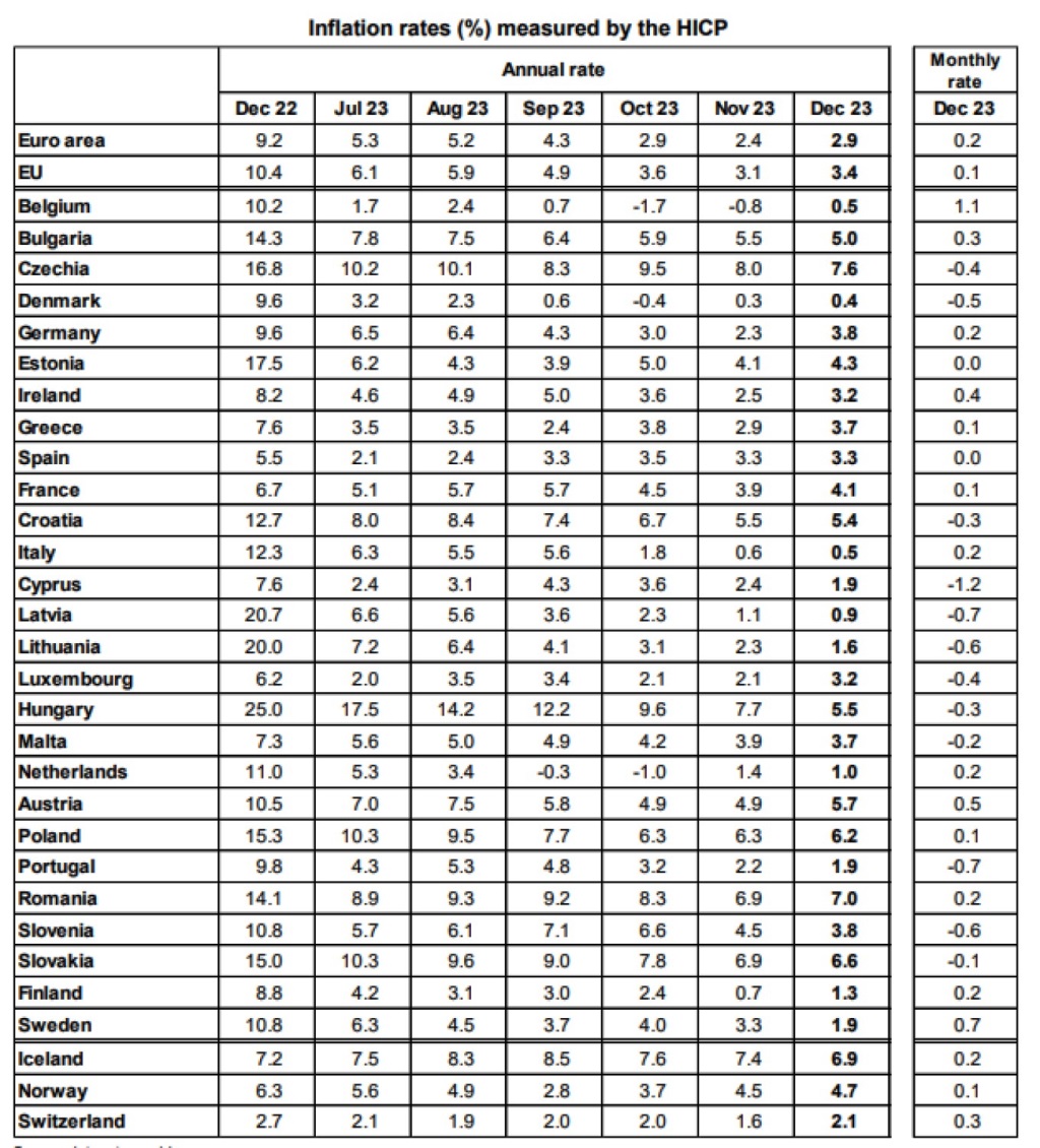 Τα χαμηλότερα ετήσια ποσοστά καταγράφηκαν στη Δανία (0,4%), την Ιταλία και το Βέλγιο (αμφότερα 0,5%). Τα υψηλότερα ετήσια ποσοστά καταγράφηκαν στην Τσεχία (7,6%), τη Ρουμανία (7,0%) και τη Σλοβακία (6,6%).