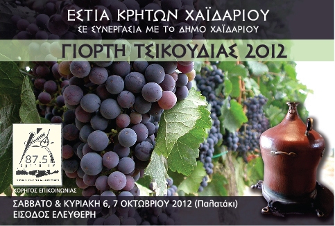 Η Εστία Κρητών σε συνεργασία με τον Δήμο Χαϊδαρίου σας καλεί στις διήμερες εκδηλώσεις για τη Γιορτή Τσικουδιάς 2012 που διοργανώνουν το Σάββατο 6 και την Κυριακή 7 Οκτωβρίου, στο Παλατάκι.
