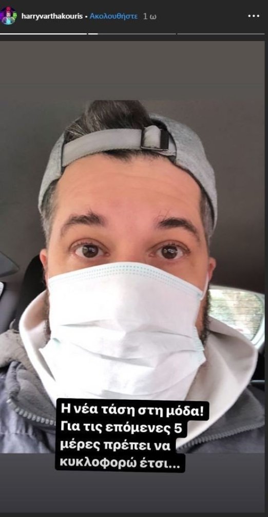 «Η νέα τάση στη μόδα. Για τις πέντε μέρες θα πρέπει να κυκλοφορώ έτσι», έγραψε στη λεζάντα της φωτογραφίας που ανέβασε ο Χάρης Βαρθακούρης ενώ σε επόμενο story του εξήγησε