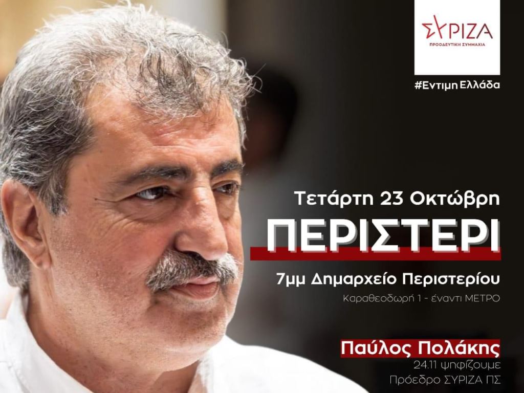 Ο υποψήφιος Πρόεδρος του ΣΥΡΙΖΑ ΠΣ. και Βουλευτής Χανίων, Παύλος Πολάκης, συνεχίζει το πρόγραμμα περιοδειών του με επόμενη στάση το Περιστέρι.