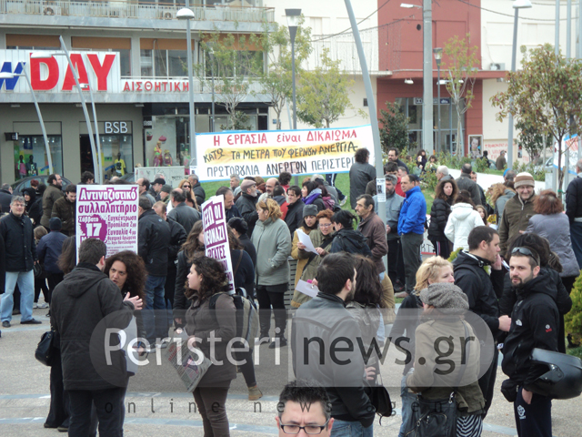 Εργαζόμενοι, άνεργοι, μαθητές, φοιτητές, γονείς με παιδιά, άνθρωποι από το Περιστέρι αλλά και από άλλες περιοχές της Δυτικής Αθήνας συναντήθηκαν χθες στην πλατεία Δημαρχείου, στις 12, έπειτα και από το κοινό κάλεσμα των συνελεύσεων, πρωτοβουλιών και δικτύων του Περιστερίου (Πρωτοβουλία κατοίκων Αγ.Τριάδας, Κάτοικοι Αγ. Ιεροθέου, Κάτοικοι Λόφου Αξιωματικών, Δίκτυο Αλληλεγγύης και Αντίστασης Μπουρναζίου, Ανοιχτή Λαϊκή Συνέλευση Περιστερίου).