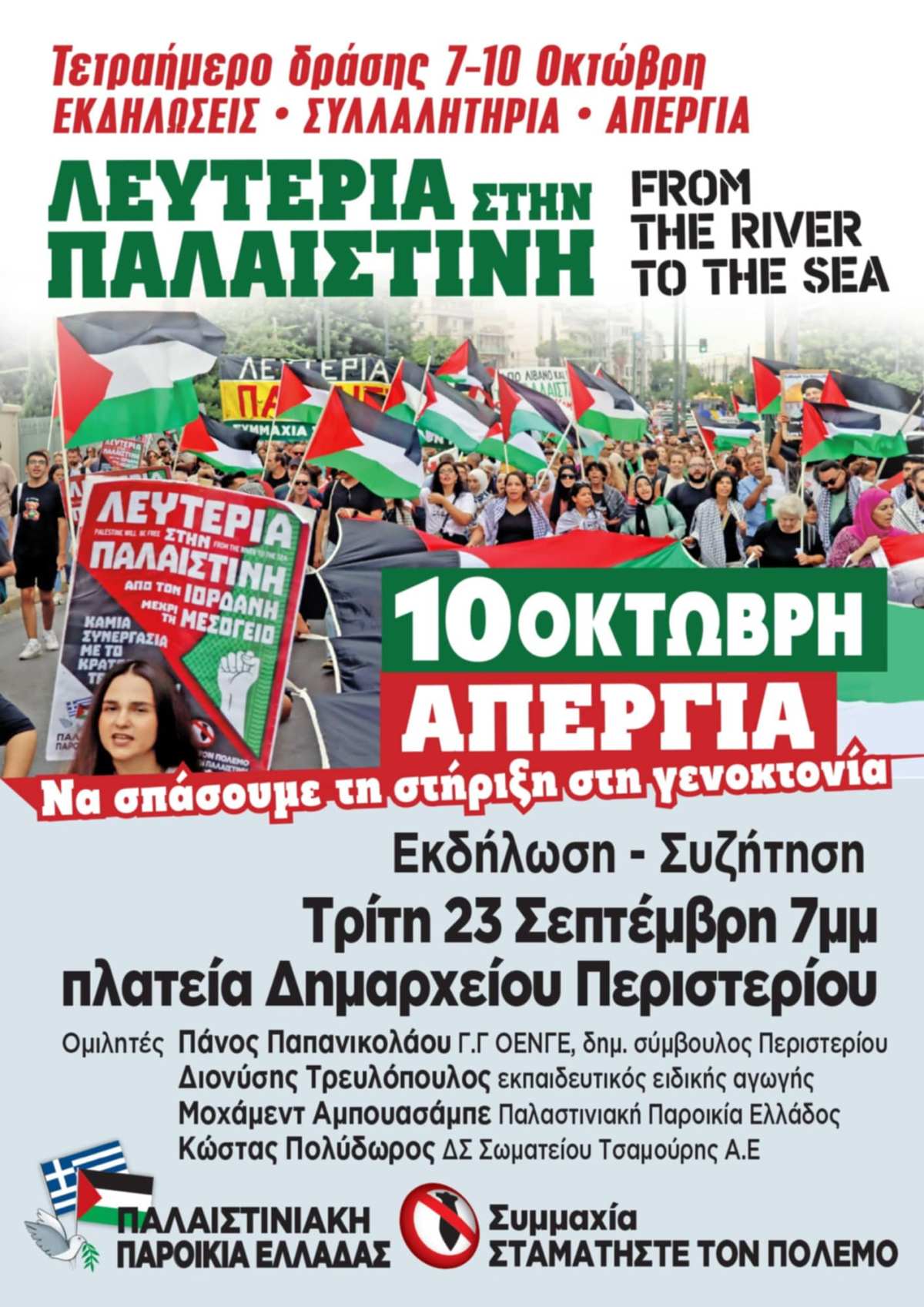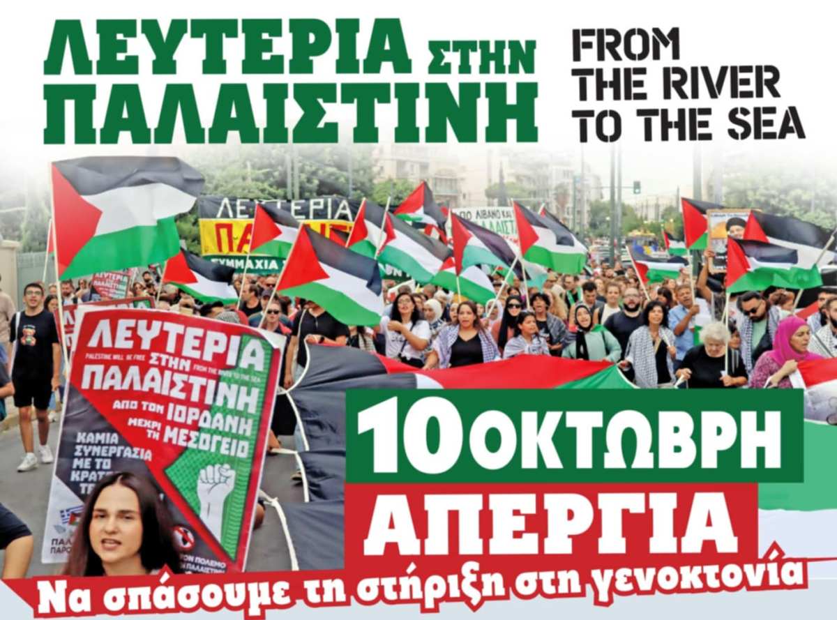 Σωματεία και συλλογικότητες καλούν σε απεργιακή κινητοποίηση την Παρασκευή 10 Οκτωβρίου, με κεντρικό αίτημα τη διακοπή κάθε πολιτικής, στρατιωτικής και οικονομικής συνεργασίας της Ελλάδας με το Ισραήλ. Η κινητοποίηση συμπίπτει με τη συμπλήρωση δύο ετών από την έναρξη της επίθεσης του Ισραήλ στη Γάζα, την οποία οι διοργανωτές χαρακτηρίζουν «γενοκτονική».