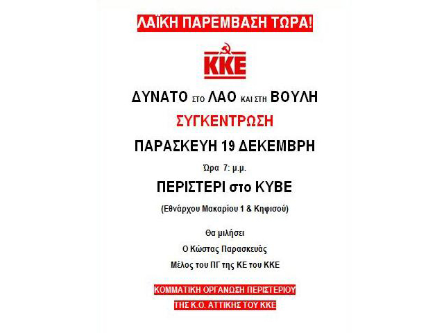 Την Παρασκευή 19 Δεκεμβρίου, στις 7 μ.μ. συγκέντρωση στο Περιστέρι, στο ΚΥΒΕ (Εθνάρχου Μακαρίου 1), με ομιλητή τον Κώστα Παρασκευά, μέλος του Πολιτικού Γραφείου της Κεντρικής Επιτροπής του ΚΚΕ και γραμματέα της Κομματικής Οργάνωσης Αττικής.
