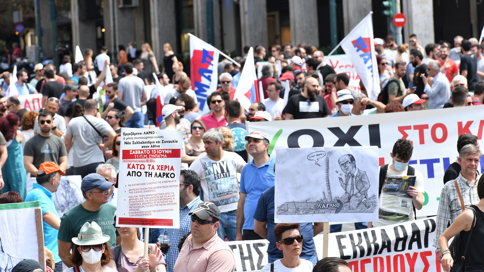 Με σύνθημα «Κάτω τα χέρια από τη ΛΑΡΚΟ» πραγματοποίησαν συλλαλητήριο σήμερα στο Σύνταγμα οι εργαζόμενοι μαζί με ομοσπονδίες, εργατικά κέντρα και φορείς του εργατικού-λαϊκού κινήματος. Οι εργαζόμενοι της ΛΑΡΚΟ διαδήλωσαν μπροστά στο υπουργείο Οικονομικών, μαζί με τις οικογένειές τους, εργαζόμενους και κατοίκους από όλη τη Στερεά. Ξεκίνησαν με πορεία από την Ομόνοια, ενώ στο Σύνταγμα τους περίμεναν συνδικάτα και μαζικοί φορείς της Αττικής για να εκφράσουν την αλληλεγγύη τους. Μηνύματα στους εργάτες της ΛΑΡΚΟ απέστειλαν δεκάδες Εργατικά Κέντρα, Ομοσπονδίες και Σωματεία από όλη την χώρα. Επίσης, οι εργαζόμενοι της ΛΑΡΚΟ παρέδωσαν ψήφισμα στη Βουλή.