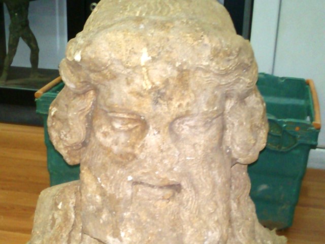 Συγκεκριμένα η προτομή απεικονίζει την κεφαλή, τον λαιμό και τμήμα του θώρακα ώριμου γενειοφόρου άνδρα με πλούσια κώμη πιασμένη στο πίσω μέρος του κεφαλιού. Η κώμη πλαισιώνεται επίσης από στεφάνι ή ταινία και εκατέρωθεν του κεφαλιού πέφτουν στους ώμους και τον θώρακα δύο -2- βόστρυχοι. Η μύτη είναι σπασμένη, όπως και το κάτω και αριστερό τμήμα της γενειάδας. Στα πλάγια φέρει τετράπλευρες οπές στερέωσης.