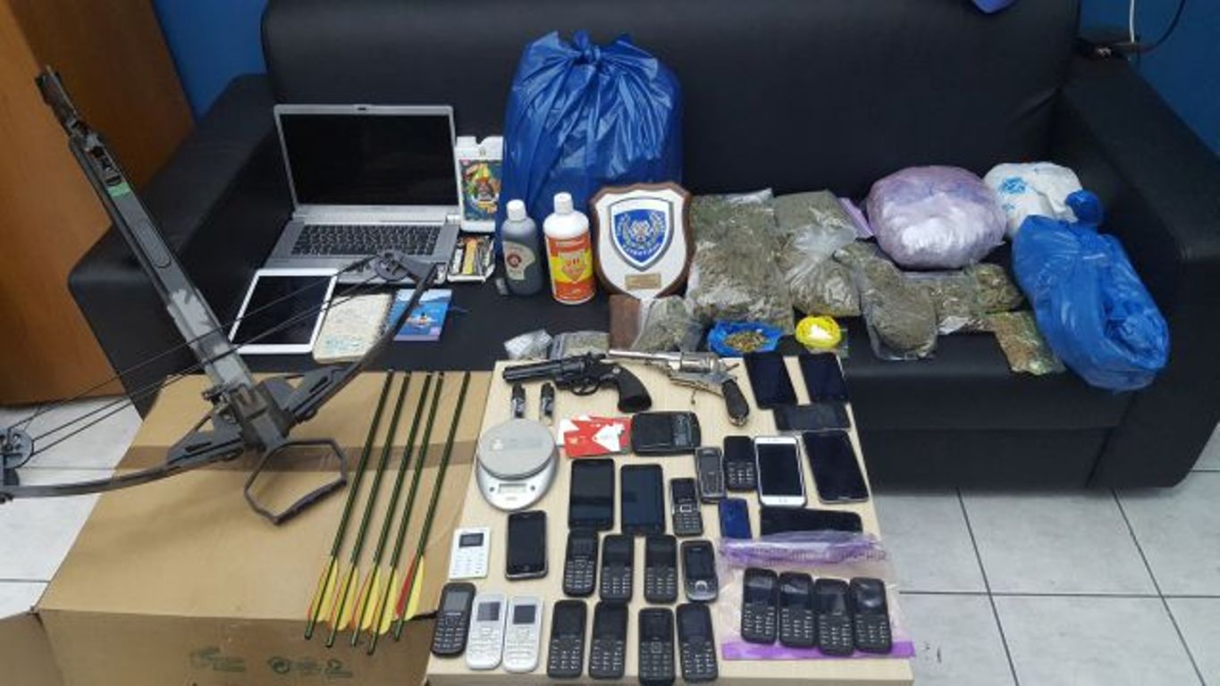 Επίσης, κατασχέθηκαν δύο περίστροφα, 21 φυσίγγια κρότου κεντρικής πυροδότησης, 2 σπρέι πιπεριού, 2 ζυγαριές ακριβείας, μία βαλίστρα με πέντε 5 βέλη, ένας φορητός υπολογιστής,29 κινητά τηλέφωνα και 3 υγρά λιπάσματα.
