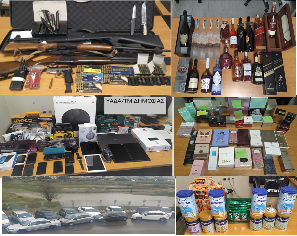 Από τις έρευνες που πραγματοποιήθηκαν βρέθηκαν και κατασχέθηκαν πιστόλι, τρία κυνηγετικά όπλα, 281 φυσίγγια διάφορων διαμετρημάτων, δύο μαχαίρια, συσκευή εμπλοκής τηλεπικοινωνιών, 22 κροτίδες, 2.500 ευρώ, 5 λίρες Αγγλίας, πλήθος ρούχων με ετικέτες, αθλητικών παπουτσιών, ηλεκτρονικών ειδών, ηλεκτρικών εργαλείων και τροφίμων και έξι οχήματα.