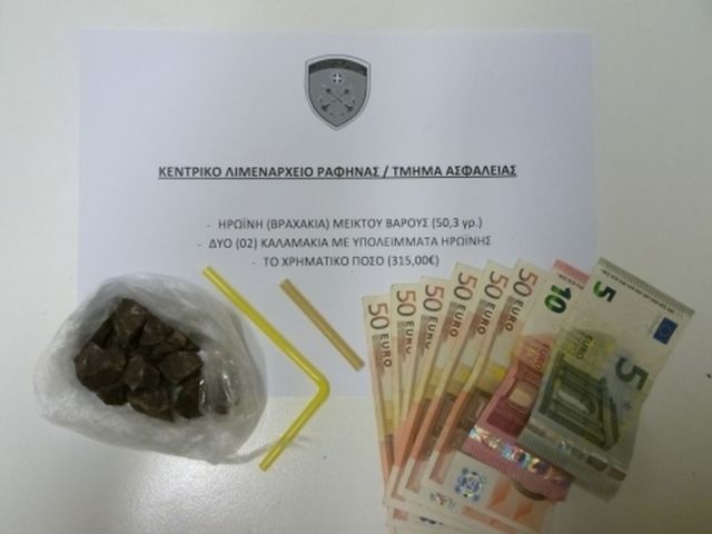 Κατά τη διάρκεια ελέγχου που διενεργήθηκε στην χερσαία ζώνη του λιμανιού της Ραφήνας, βρέθηκαν στις τσέπες του 50χρονου βρέθηκε ποσότητα ναρκωτικής ουσίας (ηρωίνη) βάρους 50,3 γραμμαρίων καθώς και χρηματικό ποσό των 315 ευρώ.