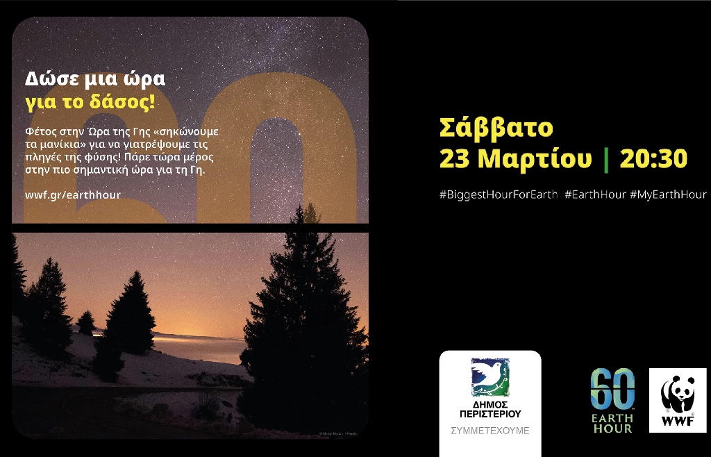 Ο Δήμος Περιστερίου συμμετέχει και φέτος στην παγκόσμια πρωτοβουλία Ώρα της Γης 2024, που διοργανώνει η περιβαλλοντική οργάνωση WWF για την προστασία του περιβάλλοντος.