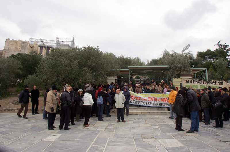 “Οχι στις απολύσεις” έγραφε το πανό που ανάρτησαν, στα Προπύλαια της Ακρόπολης, οι συμβασιούχοι του υπουργείου Πολιτισμού, οι οποίοι πραγματοποίησαν συμβολική κατάληψη.