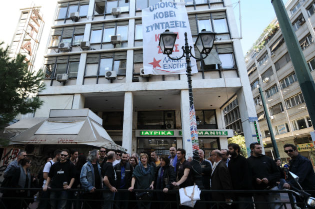 Οι διαμαρτυρόμενοι παρέμειναν μέσα και έξω από το κτήριο επί σχεδόν δύο ώρες και ανάρτησαν στην πρόσοψη ένα μεγάλο πανό με το σύνθημα «όποιος κόβει συντάξεις, κόβει ζωές».