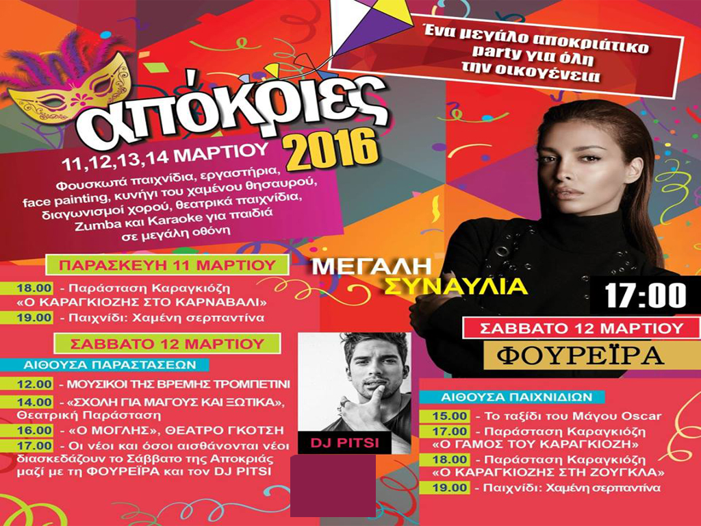 Το Σάββατο, 12 Μαρτίου 2016, ώρα 17:00, ο Δήμος Περιστερίου διοργανώνει ένα μεγάλο αποκριάτικο party για όλη την οικογένεια στο Εκθεσιακό Κέντρο Δήμου Περιστερίου (Δωδεκανήσου & Αγ. Βασιλείου, σταθμός Μετρό “Ανθούπολη”). Οι δημότες θα απολαύσουν μεγάλη συναυλία με την Ελένη Φουρέϊρα και στα decks ο dj Pitsi.