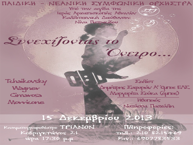 Η Παιδική Νεανική Συμφωνική Ορχήστρα, την Κυριακή 15 Δεκεμβρίου 2013 και ώρα 17.30, στο κινηματοθέατρο ΤΡΙΑΝΟΝ (Κοδριγκτώνος 21 και Πατησίων Αθήνα, τηλ: 210-8215469) διοργανώνει συναυλία με τίτλο: “Συνεχίζοντας το όνειρο”.