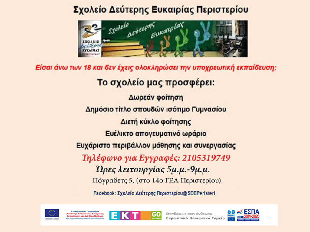 Για πληροφορίες και εγγραφές στο Σ.Δ.Ε. Περιστερίου, Πόγραδετς 5, Περιστέρι, (Θηβών και Λ. Καβάλας) επικοινωνήστε στο τηλέφωνο: 210-5319749 (5-9 το απόγευμα). Facebook: Σχολείο Δεύτερης Περιστερίου@SDEPeristeri