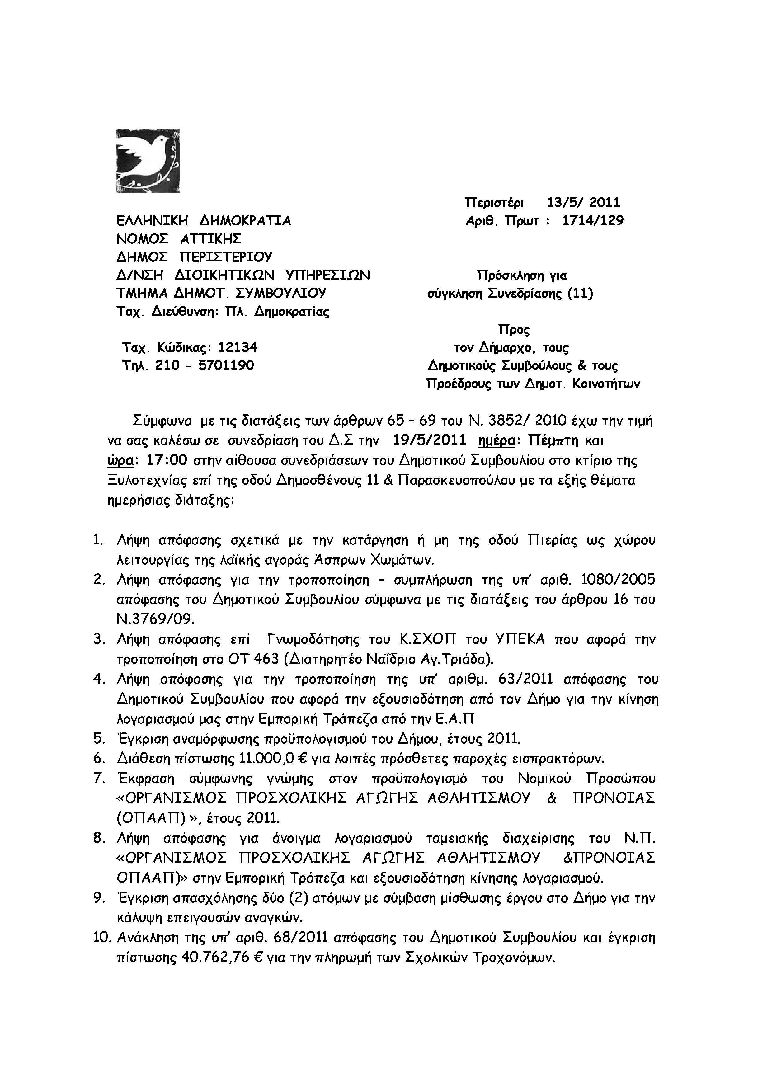 Η Πρόεδρος του Δημοτικού Συμβούλιου Περιστερίου Νεκταρία Ευσταθιάδου συγκάλεσε συνεδρίαση του σώματος την 19/5/2011 ημέρα Πέμπτη και ώρα: 17:00 στην αίθουσα συνεδριάσεων του Δημοτικού Συμβουλίου στο κτίριο της Ξυλοτεχνίας επί της οδού Δημοσθένους 11 & Παρασκευοπούλου με τα εξής θέματα ημερήσιας διάταξης: