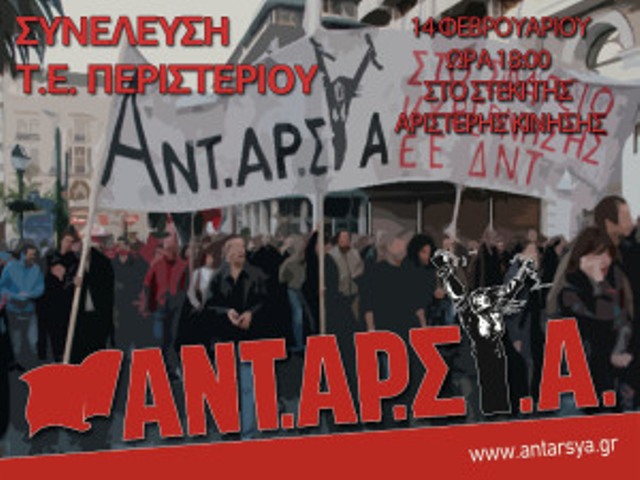 Το Σαββατο 14 Φεβρουαρίου στις 6:00, στο στέκι της Αριστερής Κίνησης Περιστερίου(Ακροπόλεως 18 και Ιάσονος), θα πραγματοποιηθεί η συνέλευση της ΑΝΤΑΡΣΥΑ Περιστερίου.