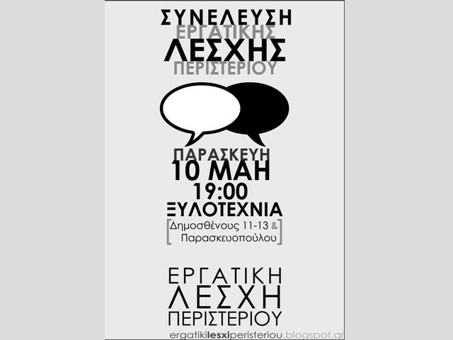 Tην Παρασκευή 10 Μαίου στις 7μμ στο θεατράκι της Ξυλοτεχνίας θα πραγματοποιηθεί η συνέλευση της ΕΡΓΑΤΙΚΗΣ ΛΕΣΧΗΣ ΠΕΡΙΣΤΕΡΙΟΥ.