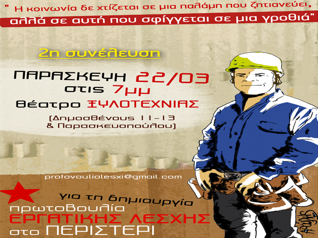 Την Παρασκευή 22 Μαρτίου στις 7 μμ στο θεατράκι της Ξυλοτεχνίας θα πραγματοποιηθεί η 2η συνέλευση της “Πρωτοβουλίας για τη δημιουργία ΕΡΓΑΤΙΚΗΣ ΛΕΣΧΗΣ στο ΠΕΡΙΣΤΕΡΙ”.
