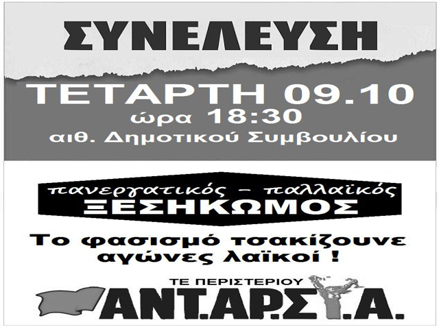 Την Κυριακή 15 Σεπτεμβρίου στις 18.00 στο θέατρο της Ξυλοτεχνίας θα γίνει η συνέλευση της τοπικής επιτροπής της ΑΝΤΑΡΣΥΑ Περιστερίου για την οργάνωση της παρέμβασης στους αγώνες και τα μέτωπα που ανοίγουν.