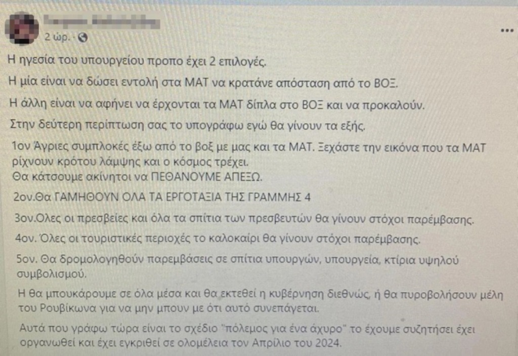 Ο νεαρός είχε παρουσιάσει τα ξημερώματα του Σαββάτου (18/5) στο προφίλ του στα social το σχέδιο -όπως το χαρακτήρισε- «πόλεμος για ένα άχυρο» καλώντας σε άγριες συμπλοκές. «Άγριες συμπλοκές έξω από το βοξ με μας και τα ΜΑΤ. Ξεχάστε την εικόνα που τα ΜΑΤ ρίχνουν κρότου λάμψης και ο κόσμος τρέχει. Θα κάτσουμε ακίνητοι να ΠΕΘΑΝΟΥΜΕ ΑΠΕΞΩ» έγραφε επίσης, προσθέτοντας πως «όλες οι πρεσβείες και όλα τα σπίτια των πρεσβευτών θα γίνουν στόχοι παρέμβασης. Όλες οι τουριστικές περιοχές το καλοκαίρι θα γίνουν στόχοι παρέμβασης. Θα δρομολογηθούν παρεμβάσεις σε σπίτια υπουργών, υπουργεία, κτίρια υψηλού συμβολισμού».