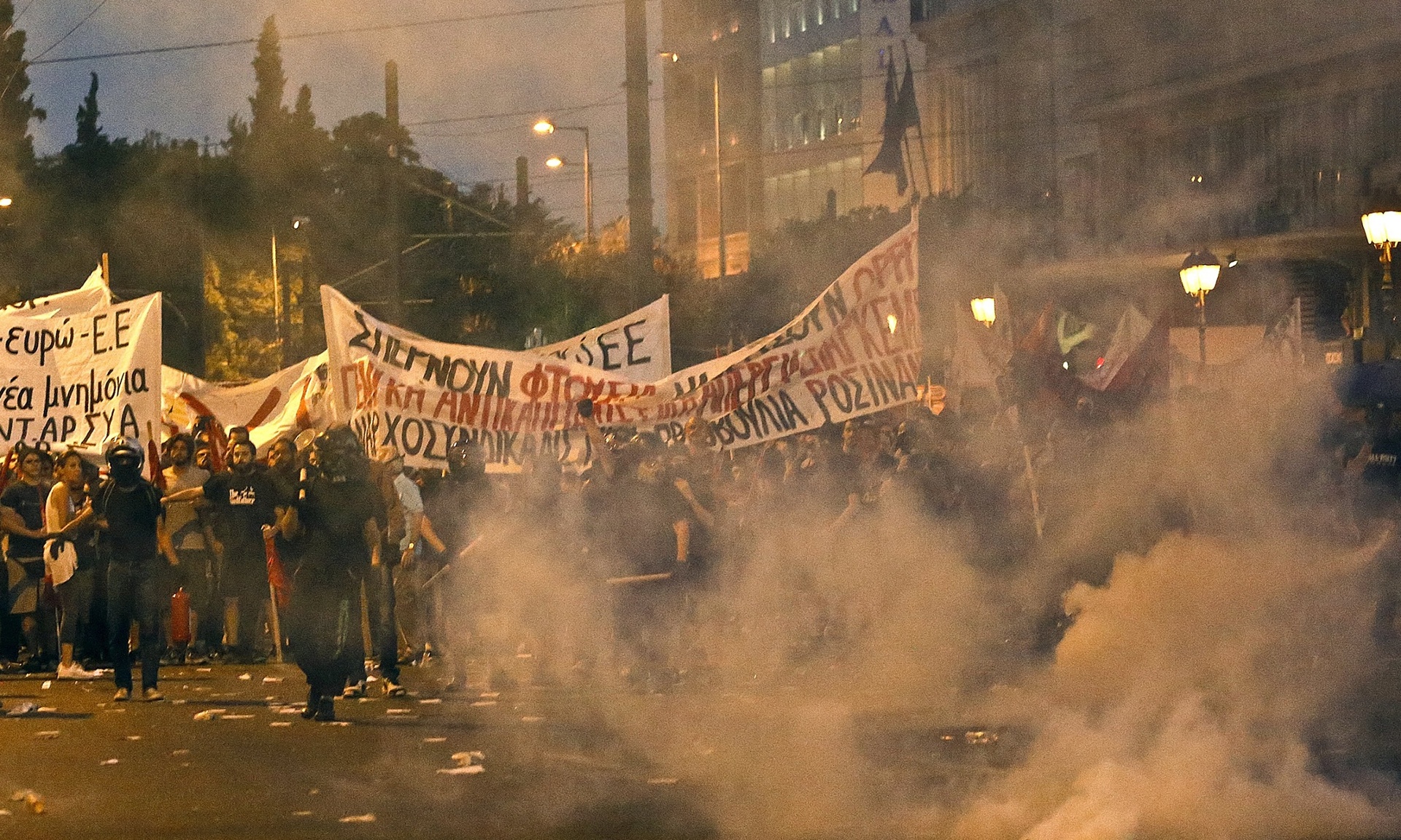 Βαν τηλεοπτικού σταθμού τυλίχθηκε στις φλόγες μπροστά από τον Εθνικό Κήπο, μετά ρίψη βόμβας μολότοφ. Αντιεξουσιατές έκαψαν ένα αυτοκίνητο στο Σύνταγμα, ενώ έσπασαν τζαμαρίες καταστημάτων και ΑΤΜ στο κέντρο της Αθήνας.