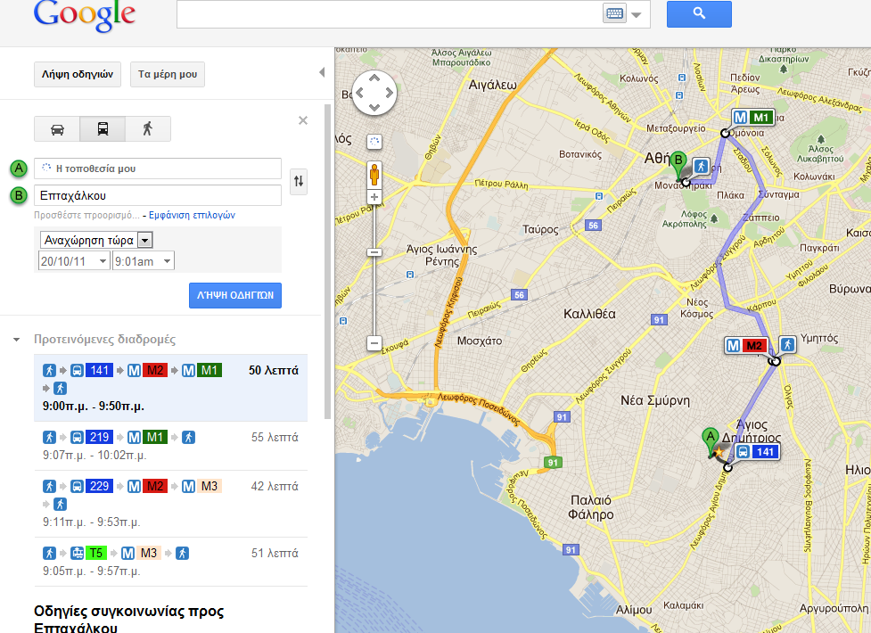 Για άμεση πρόσβαση στις παραπάνω πληροφορίες επισκεφτείτε απλώς το maps.google.gr, κάντε κλικ στo «Λήψη οδηγιών» και επιλέξτε τη μετακίνηση «Με δημόσια συγκοινωνία» (το εικονίδιο με το λεωφορείο).